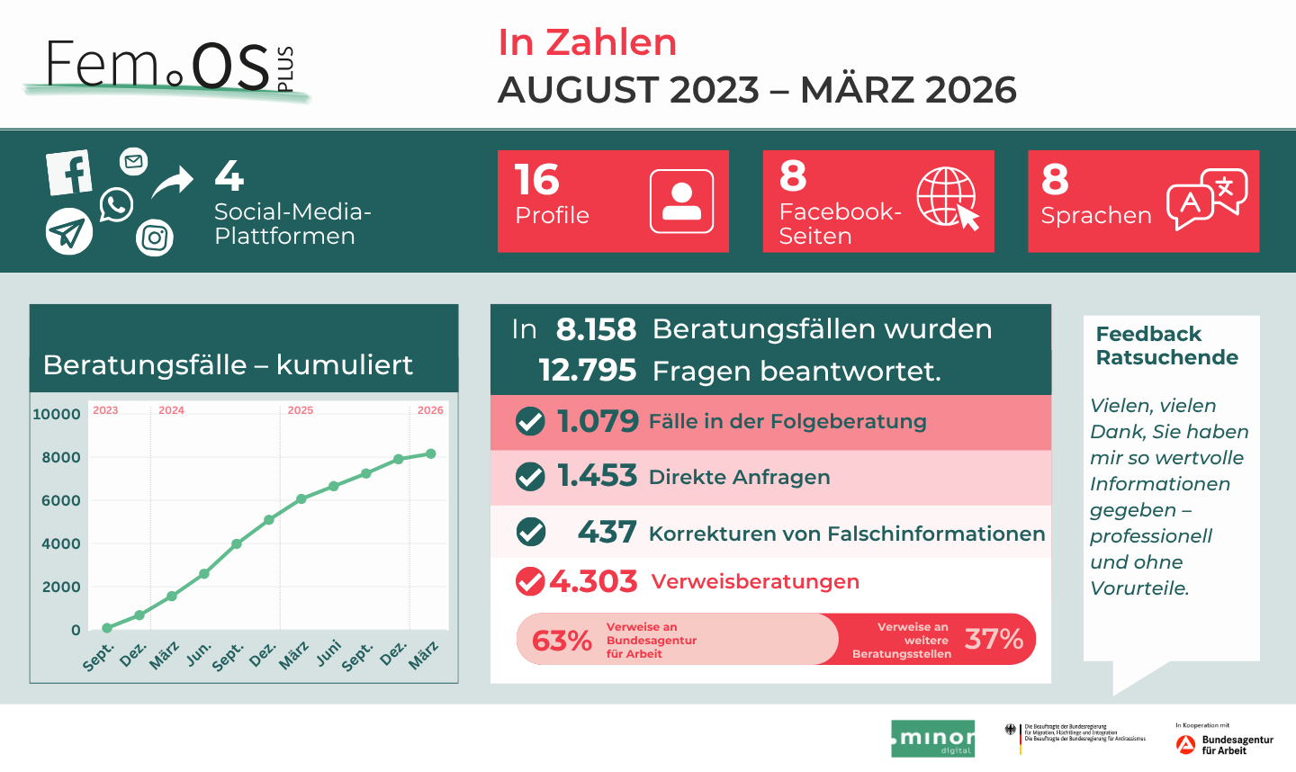 Die Beauftragte der Bundesregierung für Migration, Flüchtlinge und Integration zugleich Beauftragte der Bundesregierung für Antirassismus fördert das Projekt von Juli 2023 bis August 2026. Fem.OS Plus wird in Kooperation mit der Bundesagentur für Arbeit umgesetzt.
